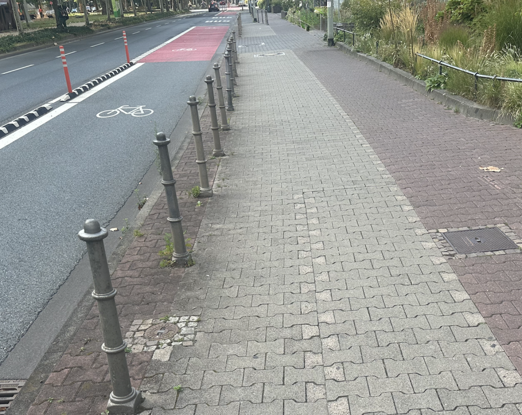 Hier ein besonders schönes Beispiel für Hostile-Traffic-Architecture. Wo früher drei kleine oder zwei große Autos bequem parken konnten, wurde ein Poller so maximal schikanös platziert, dass sich jetzt gerade einmal zwei Mittelklassewagen nur noch mit Mühe und Not in die Parkbucht zwängen können.
