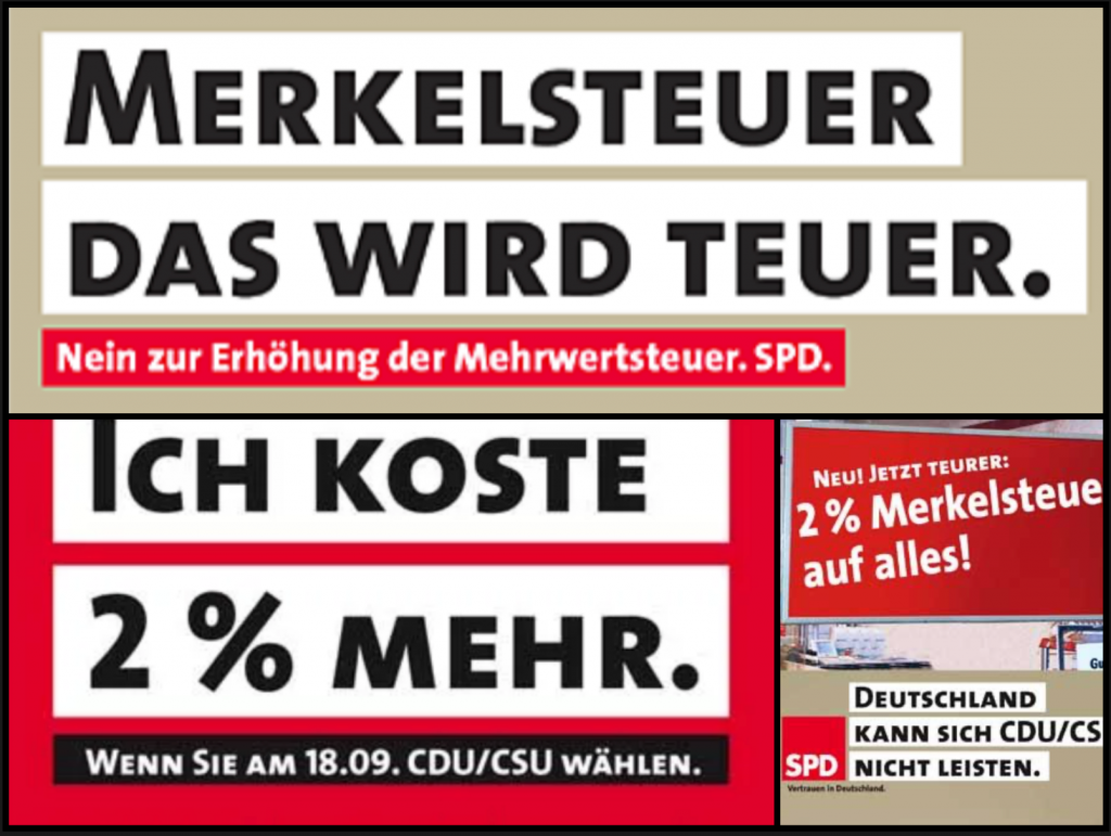 Die SPD hat im Jahr 2005 mit dem markigen Slogan „Merkelsteuer, das wird teuer“ einen leidenschaftlichen Wahlkampf gegen die von der CDU geforderte Mehrwertsteuererhöhung von 16 auf 18 Prozent gemacht – nur um nach der Wahl gemeinsam mit der CDU die Mehrwertsteuer auf 19 Prozent anzuheben. Der verwegene Coup, einfach eine 0 mit einer 2 zu einer 3 zu addieren und damit die größte Steuererhöhung in der gesamten Geschichte der Bundesrepublik zu ermöglichen, hat uns damals so sehr beeindruckt, dass wir ihn nie vergessen werden.