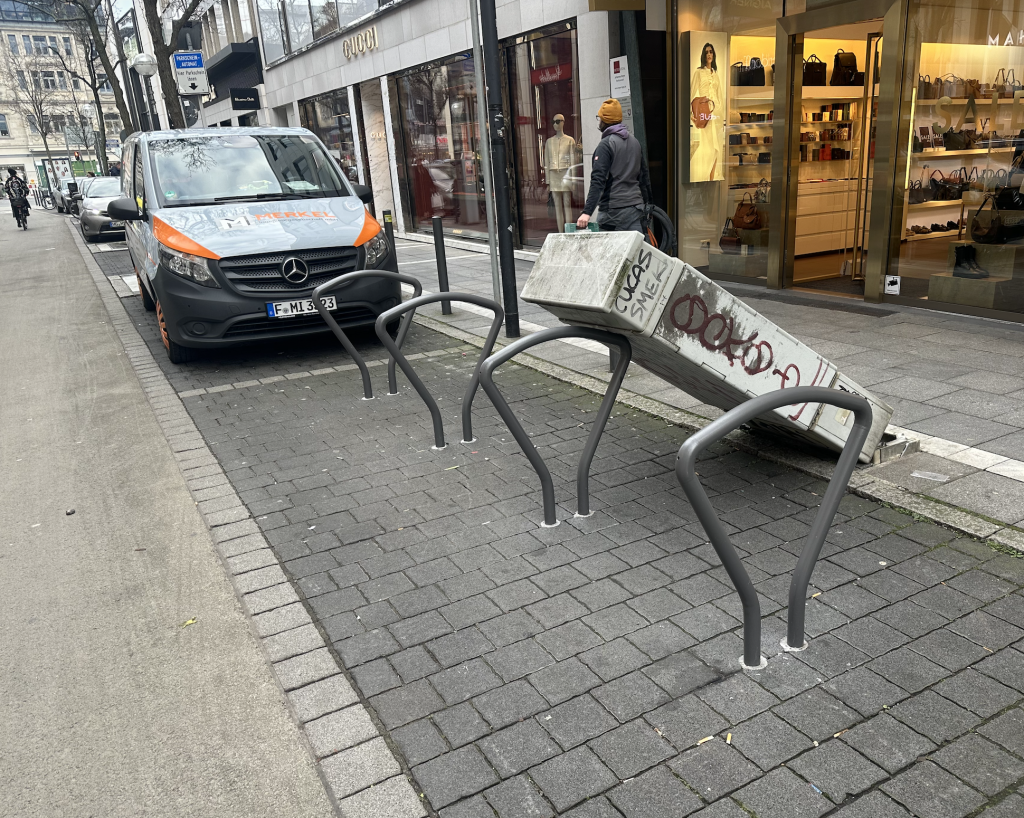 Um den ohnehin schon knappen Parkraum möglichst schikanös weiter zu verengen, werden auch gerne einmal ein paar überflüssige Fahrradbügel installiert. Leider werden sie regelmäßig umgefahren. Dabei ist uns übrigens aufgefallen, dass umgefahrene Poller und Fahrradbügel immer überraschend schnell repariert werden. Dafür scheinen Geld und Ressourcen offenbar im Überfluss vorhanden zu sein.